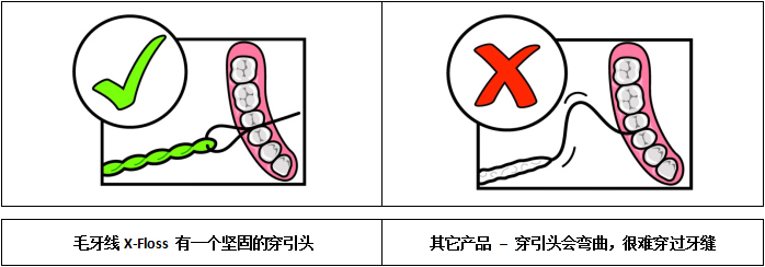 對有種植牙、齒橋、帶牙箍的正畸、寬牙縫和斜齒的牙友們會感到用X-Floss 大毛牙線和 X-Floss lite小毛牙線都很合適。